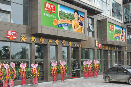 春光海南特產旗艦店坐落于三亞市河西路——黎客國際大酒店(準五星級)的一樓商鋪。由春光食品投資300多萬精心裝修成立,旗艦店面積約700平方米,是海南規模最大、最高檔的春光特產專營店。店內商品陳列錯落有致,色彩搭配賞心悅目,除春光食品特產外,還設有水晶珠寶精品專柜、特產茶煙酒專柜、海產干貨專柜、速食飲料專柜、珍珠化妝品專柜等,并銷售海南花梨、牛角雕、貝藝工藝品、椰雕、島服泳裝、箱包、墨鏡等,經營品種多達十幾個門類,上千個品種,滿足了消費者一站式購物的需要。是純玩團、會議接待等旅游休閑購物的理想選擇。物品便利、寬敞、舒適、明亮的購物通道和清楚的賣場標示,快捷的電腦收銀、便利的大巴停車空間,亮潔的化妝間,為游客提供干凈舒適并具現代感的購物環境。