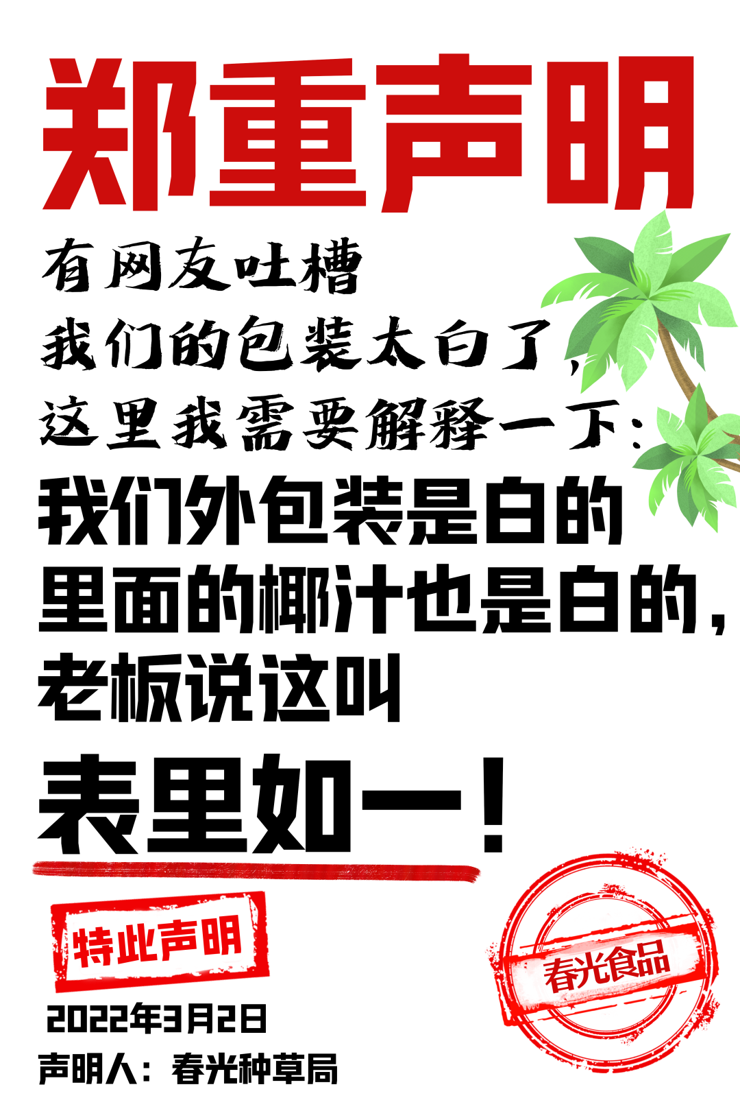 天然原料、先進工藝配上低糖配方,這些差異化舉措讓春光椰汁擁有了差異化的產品力,樹立了“新鮮”、“營養(yǎng)”的品牌形象,同時也體現了春光食品為廣大消費者提供一款優(yōu)質椰汁的初心。